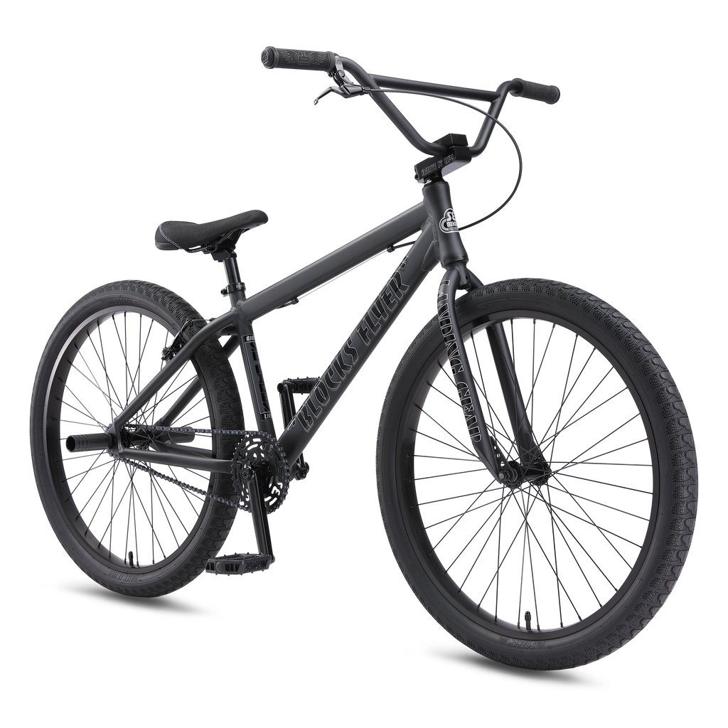 Take a ride on the 26" Blocks Flyer, a bike that's built for bike life! The 6061 aluminum Floval tubing frame is strong and stylish, and the Promax V-brake provides stopping power and control during wheelies. The SE flangeless Mushroom Wing grips will surely give you a great feel on the bars. This bike also features SE Bozack tires with superior grip for swerves, along with Wheelie Pegs so you can wheelie for blocks and blocks!