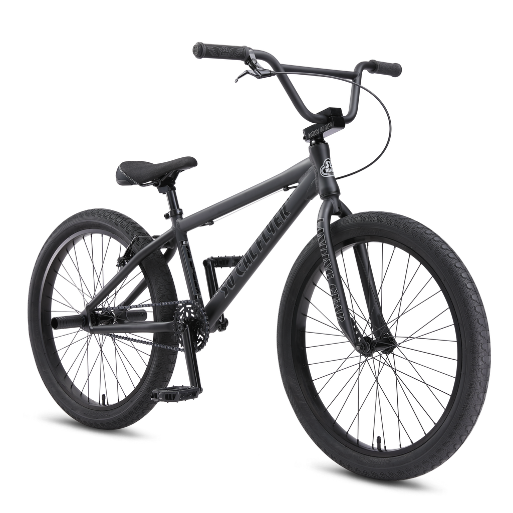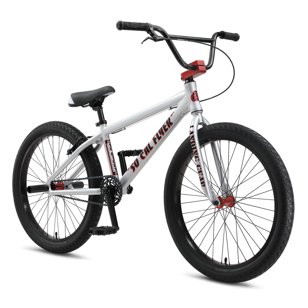 The 24" So Cal Flyer is for smaller riders who want to go big! This bike has a classic 6061 aluminum Floval tubing frame built with a sturdy & durable sealed mid bottom bracket. The Promax V-brake gives you dependable braking power when learning to wheelie, while the new SE Captive seat provides a secure and comfortable feel. The So Cal Flyer is also equipped with SE nylon fiber pedals and flangeless Mushroom Wing grips. Plus, with 24” x 2.4” Bozack tires and Wheelie Pegs included, you’ll be ready for anything.